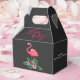 O design de convite para chá de fraldas apresenta flamingo cor-de-rosa com frondes verdes de palma e flores de hibisco tropicais. "Aloha Baby". Um padrão floral tropical com cor preta de fundo se veste na parte de trás do cartão.