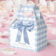 Esta caixa de favorecimento de chá de fraldas coquetel e fofinho apresenta um arco/fita azul grande em um fundo branco com xadrezes/cheques de gingham azul. Personalize-o para as suas necessidades. Você pode encontrar produtos correspondentes na minha loja.