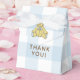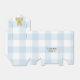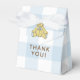 Obrigado seus convidados por vir ao seu chá de fraldas com esta bonitinha caixa de favores com um doce ursinho de pelúcia vestindo um arco azul. O plano de fundo é um padrão de verificação de búfalos azul e branco. Texto na frente diz "Obrigado!"