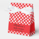Caixa de favorecimento do chá de panela branco e vermelho. Bolinhas brancas sobre fundo vermelho e uma banda vermelha com seu texto personalizado.