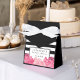 As caixas de favor de chás de panela elegantes apresentam uma paleta de cor rosa-chic e preta, com um painel frontal de faixa branca e preta e um conjunto de flores de peônia de cor d'água em rosa magenta e quartzo rosa, cor 2016 do ano. Adicione o nome do convidado de honra, o tipo de evento e a data na coordenação da inscrição negra.