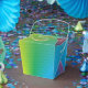 Um partido de crianças brilhantes favorece uma caixa em cores iluminadas do arco-íris.