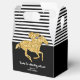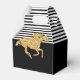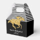 Caixas de favores para decoração de gable com tema de derby de noivado apresentam um cavalo de corrida em brilho dourado falso em listras pretas e brancas na parte superior e preto na parte inferior com sua mensagem pessoal. Itens CORRESPONDENTES em nossa coleção.
