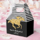 Caixas de favores para varanda com tema de Derby para chuva de presentes de noivado apresentam um cavalo de corrida em brilho dourado falso em listras pretas e brancas na parte superior e preto na parte inferior com sua mensagem pessoal. Itens CORRESPONDENTES em nossa coleção.