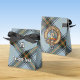 Crachá da crista Clan Bell rodeado por uma correia e fivela sobre o tartan. Texto personalizado e monograma.