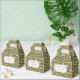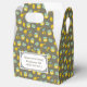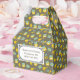 Um padrão de abelhas do mel voando é mostrado na caixa, voando ao redor de uma colher de mel de madeira, pingando com mel, potes de mel e etiquetas de preços. Dê aos seus amigos uma caixa personalizada para carregares pequenos potes de mel em casa. Edite o texto para adicionar seu nome de negócios e informações apiários. Você pode substituir a borda por sua própria imagem ao redor do texto. Encontre o adesivo correspondente na coleção para rotular seus potes de mel.