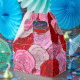 Uma ilustração minuciosa das camadas e camadas de rosas totalmente floridas em vermelho, rosa e lavanda.