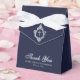 Uma elegante caixa de lembrancinha de comunhão solene de menino azul marinho e prata. Na aba, tem uma crista vintage com uma cruz no centro, ambas em folha de prata falsa.