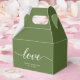 Personalizaram essas caixas de favoritos com os nomes da noiva e do noivo e a data do casamento. Elegante, simples e chic com uma letra moderna para a palavra "Amor". Preto, branco e elegante. Motif de casamento verde de Moss.