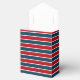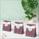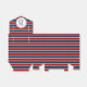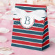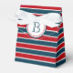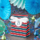 Design de temas náuticos com decoração em forma de monograma, em forma redonda, com estrelas sobre fundo listrado a azul, vermelho e branco