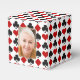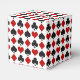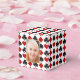 This is a cute gift favor box for a variety of occasions. It features the familiar red, black, and white pattern of diamonds, hearts, spades and clubs commonly found in a deck of playing cards. The front of the box has a gold frame around your own photograph or image. Bright and colorful for most gift giving occasions, and especially appropriate for card clubs, or even retirement parties!