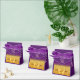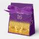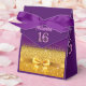 Uma elegante e glamourosa caixa de 16 anos, 16 anos. Plano de fundo brilhante roxo e ouro com fita e arco dourados. Com o texto: Doce 16 (x3) Modelo pelo nome da aniversariante. Letras cor-de-rosa.Verso: o texto:Obrigado.