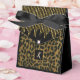 Bela caixa de favor com lantejoulas douradas impressas com diamante na parte superior e estampa de leopardo na frente e atrás. A letra do monograma personalizável está em uma moldura dourada e fundo preto. É perfeito para qualquer ocasião como aniversário, casamento, aniversário e mais