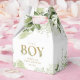 Uma elegante É uma caixa de chá de fraldas de menino com folhagem verde e tipografia de ouro chico. Você pode personalizar com seu próprio obrigado sua mensagem sob a tampa. Uma maneira perfeita de dizer obrigado aos seus hóspedes! Projetado por Thisnotme©