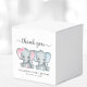Caixas de presentes bonitinhas para a sua menina e gêmeos chá de fraldas com "obrigado você" e "Dois Docinhos Doce Estão a Caminho" escritas em uma fotografia de cinza divertida e um roteiro de na moda com cinzas e aquarelas cor-de-rosa e azul de elefantes gêmeos para bebês. Personalize o nome da futura mãe e a data do chá em uma simples tipografia de cinza.