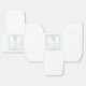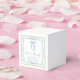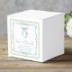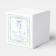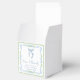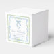 Caixas de lembranças elegantes para chá de noiva com molduras de aquarela florais azuis e verde escamado, um delicado laço coquete azul em aquarela, "amor + agradecimento" exibido em uma elegante caligrafia azul, e o nome da noiva e a data do chá em tipografia clássica serif.