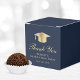 Elegante caixa de festa de formatura azul escuro com boné dourada, "Obrigado" em um roteiro clássico de ouro, e o nome do formando e a data da festa na tipografia moderna de ouro claro.