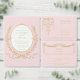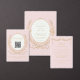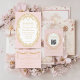 Esta pequena caixa de favor tem um exterior rosa pincelado e uma estrutura quadrada decorativa em cada lado. Seus nomes e data de casamento estão cercados por uma coroa de louros no flape superior em uma fonte de ouro. Esta caixa de favoritos coordena-se com os outros produtos da Coleção de Casamentos de Vintage Pink Paris Glam.