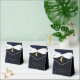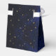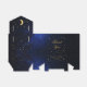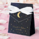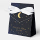 Uma caixa de lembrança de casamento azul dourada para um tema de casamento celestial, com estrelas douradas no fundo do céu noturno azul escuro.
