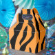 Este Impressão Tiger falso apresenta faixas de Tigre simuladas em preto sobre um plano de fundo vermelho laranja gradiente.