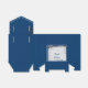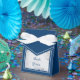 Uma praia arenosa com fios de seagrass, foto central para um casamento romântico de destino. As caixas de favoritos em um marinho limpo e branco trazem um pouco do ambiente costeiro para a mesa favorável. A tipografia elegante acrescenta o toque final.