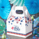 Esta caixa de favor brilhante apresenta uma design divertida do Dia da Independência de estrelas decorativas vermelhas, brancas e azuis em um arco gracioso sobre uma bela caligrafia que diz 'Feliz 4 de julho'. Perfeito para aquelas festas e churrascos à medida que celebramos a ocasião. Procure ID1103 para ver todos os produtos de coordenação com este design alegre.