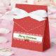 Caixa de favor festiva com uma cor de fundo principal de vermelho e um padrão de bolinhas brancas minúsculas. Na frente, há uma banda de efeito de renda branca com as palavras Feliz Natal em letras verdes com uma sombra vermelha. Abaixo das letras está um arco vermelho com três folhas verdes e groselhas vermelhas.