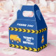 Caixa de festa de aniversário de um caminhão de lixo legal e personalizado para uma criança que ama veículos de construção amarelos em um fundo azul divertido. Design de veículo divertido para um menino que ama carros e caminhões. Personalize com o nome do seu filho entre a fita de precaução preto e amarelo.