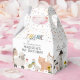 A festa de aniversário personalizada favorece caixas com um simples fundo branco, confete de celebração, animais de fazenda adoráveis, incluindo uma vaca, cabra, porco, burro, cavalo, coelho, pato e um galo, um obrigado que você envia, e o nome e a idade da criança.
