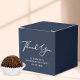 Caixa de favorecimento de festa de formatura azul elegante com "Obrigado" em um roteiro branco chico e o nome do formando e a data da festa em caracteres brancos simples.