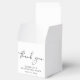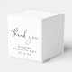 Caixa de favorecimento de festa de formatura gráfica com "Obrigado" em um roteiro elegante e o nome do formando e a data da festa em uma simples tipografia moderna.