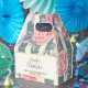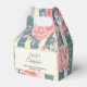 Pequena caixa de favores com um belo padrão com flores bonito cor-de-rosa sobre um padrão listrado composto por listras azuis e creme.