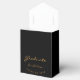 Classe de 2024. Para uma celebração moderna e moderna de graduação. Um fundo preto chic. O texto: Obrigado! e o Formando são escritos com um grande estilo escrito à mão, letras de ouro. Modelo de nome e ano.