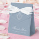 Uma caixa de favor azul empoeirada para o batismo de um menino. No flape, tem uma crista de folha de prata suja com uma cruz. A mensagem Obrigado está escrita na parte inferior, num roteiro de cinza elegante, a ocasião e a data são escritas em bonés por baixo. O fundo é azul empoeirado.