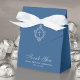 Uma elegante caixa de favores de um menino azul e prata. No flape, ele tem crista vintage com uma cruz dentro, ambas a partir de folha de prata falsa. A mensagem "Obrigado" está escrita na parte inferior, num elegante roteiro falso de prata, a ocasião e a data são escritas em bonés de cinza. O fundo é azul clássico.