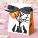 Esta design adorável é perfeita para amantes de gatos e Halloween. Este design digital apresenta as silhuetas de quatro gatos ao redor de uma árvore. Acima, a lua brilha brilhante, com três pequenos morcegos, à distância. Os dois painéis laterais são cor de laranja no Halloween e o texto diz "No Tricks Simplesmente trata". Esta caixa de favor tem uma fita preta para amarrar bem as suas guloseimas.