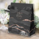 Esta elegante caixa de favor moderno apresenta um design de ágata em aquarela preta aparada com brilho falso de rosa dourada. Personalize-o com os nomes da noiva e do noivo em letra manuscrita rosa sobre um grande e comercial preto, juntamente com a data do casamento abaixo.