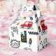A playful, cartoon-style city pattern featuring buses, cars, helicopters, traffic lights, buildings, and fun doodle text like “Beep Beep,” “Wuz Up?” and “Go,” in bright red, yellow, blue, and black tones.