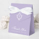 A lavender favor box for a baptism. On the flap, it has a white crest with a cross in it.
