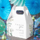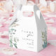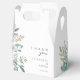 Uma caixa de favoritos de casamento refinada, com elegantes ilustrações de folha botânica em tons verdes, beges e dourados mudados. A escritura moderna "Obrigado" acrescenta um toque sincero, enquanto seus nomes e datas personalizam a design. Perfeito para na moda, casamentos inspirados na natureza ou celebrações ao ar livre.