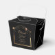 As Caixas de Favor do Casamento de Lua Negra Celestial Dourada do Sol, exibem um elegante sol dourado, lua e estrelas com um quadro de ouro sobre fundo preto. Dentro é o seu obrigado personalizado da caixa de favoritos. Projetado pelo Evco Studio www.zazzle.com/store/evcostudio
