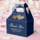 Coloque seus presentes de chá de panela/casamento nessas caixas azuis românticas de marinho azul com cadarços florais brancos e luzes de cordas em um fundo de burlap.