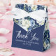 Caixa de favorecimento de padrão floral de pénia branca e azul-marinho, para um casamento no inverno moderno. Um elegante spray botânico de folhas verdes desdobra-se cercado por flores azuis-claras e marfim. O moderno guião manuscrito lê Obrigado acima dos nomes dos casais do casamento e da data do evento.