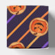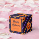 Um delicioso design da caixa de favoritos do Halloween que apresenta a ilustração de um biscoito laranja de abóbora e listras laranja no fundo azul escuro do marinho. Todo o texto é editável para que você possa fazer sua própria Caixa de Favoritos do Dia das Bruxas personalizada.