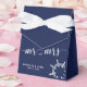 Caixas náuticas, azuis e brancas, de favores de casamento (caixa de propinas com fita branca) com roda branca e texto modificável - você pode adicionar o nome da noiva e do noivo e a data do casamento.