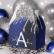 Caixa de Presente de Papel para Festa com Monograma e Inicial em Brilho Prateado e Azul Marinho em Faux Foil Metálico Brilhante. Isto torna o presente perfeito para aniversário de 16 anos, casamento, chá de noiva, aniversário de casamento, chá de bebê ou despedida de solteira para alguém que ama luxo e estilos chiques e glamorosos.
