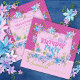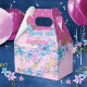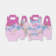 Bela festa de aniversário "Obrigado" caixa de favoritos com flores cor-de-água rosa, azuis e violeta, espirais verdes e pedaço de pergaminho para o seu texto, sobre fundo roxo e rosa-bebê com bolinhas brancas. Design bonitinho, colorido, feminino, faz uma decoração perfeita para comemorações de primavera/verão e também um presente de excelente para seus convidados.