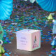 Fundo holográfico rosa, roxo e verde de menta. Personalize e adicione 2 fotos, nome, idade e data. Texto na tampa: Obrigado por vir!