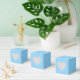 Caixa de favores com padrão de treliça em tons de azul bebê e dourado brilhante falso para complementar a coleção abaixo.