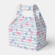 Uma pequena caixa de favor com um padrão com uma vibração de verão divertida. flamingos e abacaxis cor-de-rosa, colocados sobre um padrão listrado azul claro com folhas e corações ao redor.